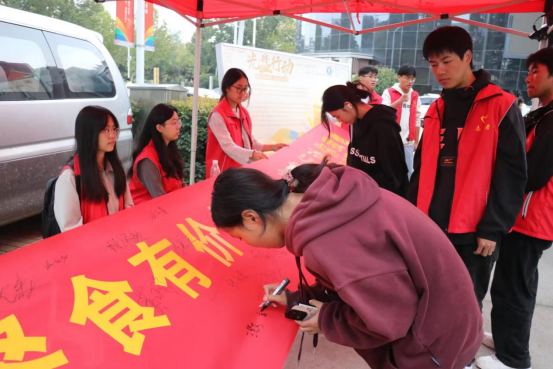 活动现场,一幅长达5米的签名条幅格外引人注目,上面“餐食有价粮无价·光盘行动你我他”的标语激励着过往师生驻足关注。同学们纷纷在条幅上郑重签下自己的名字。以仪式感强化节约意识,展现新时代青年的担当。勤俭节约是永不褪色的传统美德,餐桌文明则是社会风尚最直观地体现。珍惜盘中餐,是美德、是素养、更是我们每个人的共同责任。“谁知盘中餐,粒粒皆辛苦”的诗句,穿越千年,依然振聋发聩。小小的餐桌,不仅是生命延续的保障,更是文明礼仪与节俭传统的传承之地。让我们即刻行动,从我做起,拒绝浪费。