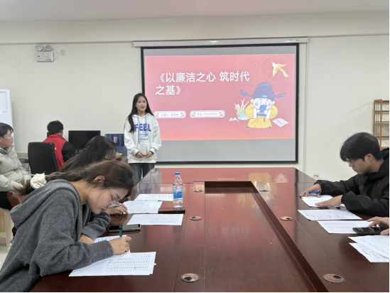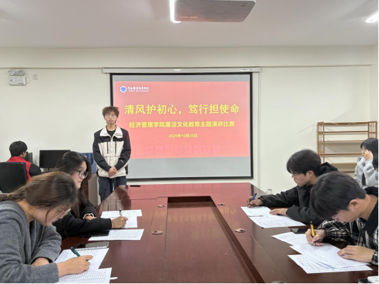 为深入学习贯彻全面从严治党要求,大力弘扬廉洁文化,引导广大青年学生树牢廉洁自律意识,10月30日,经济管理学院在笃行楼625成功举办廉洁文化教育主题演讲赛。此次活动得到全院学生积极响应,吸引了来自各专业的同学同台竞技,他们以铿锵之音传递廉洁理念,以真挚感悟诠释清风正气,为现场观众呈现了一场兼具思想性与感染力的廉洁文化盛宴。
