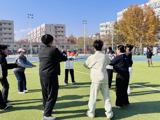 如果说“抖甩公鸡下蛋”比拼的是个人灵活度,那么“同心鼓”“巨人脚步”等项目则充分展现了团队协作的重要性,也正是“一站式”学生社区倡导的“互助共生”理念的生动实践。在“同心鼓”赛场,10名队员手拉鼓绳,紧盯空中的皮球,通过默契配合调整力度与方向,让皮球在鼓面稳稳弹跳。“一二、一二”的口号声此起彼伏,成为赛场上最动人的旋律。“巨人脚步”项目中,队员们脚绑绑带,同步迈出步伐,有的队伍虽不慎摔倒,却迅速起身继续前行,展现出顽强的拼搏精神与深厚的团队情谊。