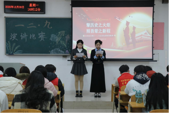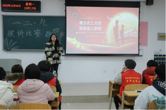 为赓续“一二·九”运动红色血脉,激扬新时代青年责任担当,12 月 8 日,经济管理学院纪念“一二·九”运动 90周年演讲比赛在明德楼 2408 教室举行。来自学院各班级的参赛选手以铿锵之音回溯峥嵘岁月,以赤诚之心礼赞爱国情怀,以青春之姿诠释使命担当,为现场观众呈现了一场兼具思想厚度、情感温度与青春力度的精神盛宴,让爱国主旋律在校园中久久回荡。