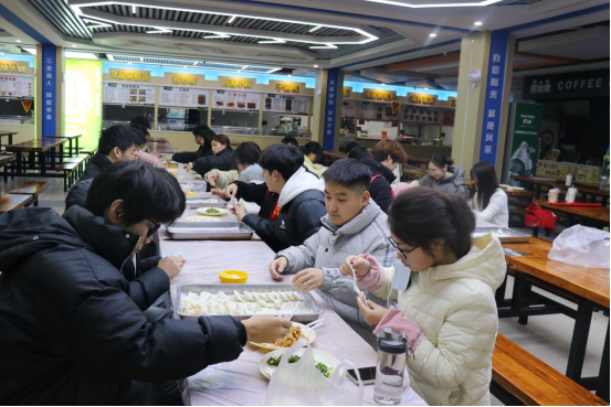 经过一个多小时的忙碌,一个个饱满圆润的饺子摆满了餐盘。随后,工作人员将包好的饺子分批放入锅中煮熟。当热气腾腾的饺子端上桌时,大家迫不及待地品尝起自己的劳动成果。咬一口鲜香四溢的饺子,暖流瞬间涌上心头。同学们互相分享美食,交流着活动中的趣事,畅谈学习与生活中的感悟,食堂内处处洋溢着温馨和谐的氛围。