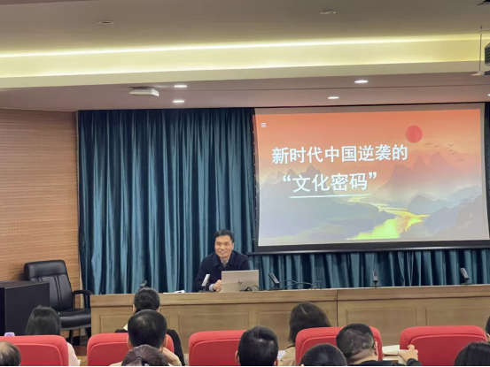 为深入学习贯彻党的二十届四中全会精神,精准把握“坚持文化自信”的战略意义与实践要求,引导全院师生将文化自信内植于心、外化于行,12月8日下午,经济管理学院党总支书记马金伟以《新时代中国逆袭的“文化密码”》为题在勤业楼238会议室作专题宣讲。学院领导班子成员、全体教职工及学生代表齐聚现场,共同聆听学习、凝聚思想共识。