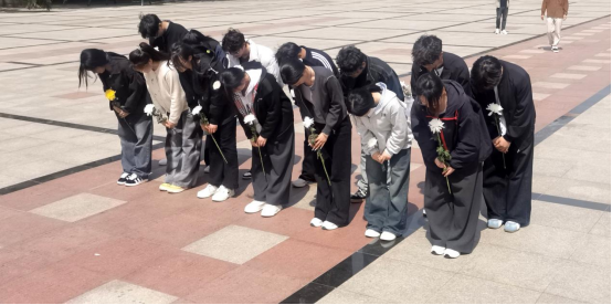 活动现场庄严肃穆,全体学生整齐列队于革命烈士纪念碑前肃立默哀,深切缅怀为民族独立、人民解放、国家富强和人民幸福英勇献身的革命先烈,深刻体悟当下和平幸福生活的来之不易。默哀礼毕,同学们手持鲜花,依次缓步前行,将鲜花敬献于纪念碑前,以芬芳敬奉英雄,以赤诚致敬先烈,用真挚心意承载无尽哀思。献花仪式结束后,全体学生面向纪念碑深深鞠躬,以最庄重的礼仪,向革命先烈致以最崇高的敬意。